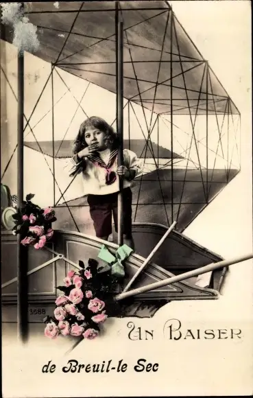 Ak Un Baiser de Breuil le Sec, Kind auf einem Flugzeug, Fotomontage