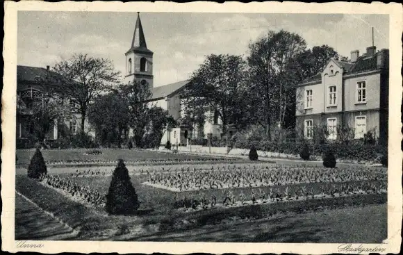 Ak Unna Westfalen, Partie im Stadtgarten mit Blick auf die Kirche