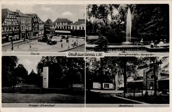 Ak Unna in Westfalen, Markt, Kriegerehrenmal, Kurgarten, Springbrunnen, Badehaus