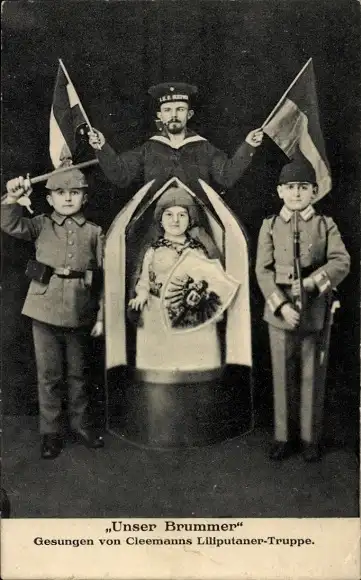 Ak Unser Brummer, Cleemanns Liliputaner Truppe, Kinder in Uniformen, Seemann