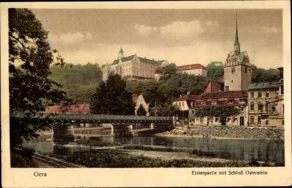 Ak Untermhaus Gera in Thüringen, Elsterpartie mit Schloss Osterstein, Brücke