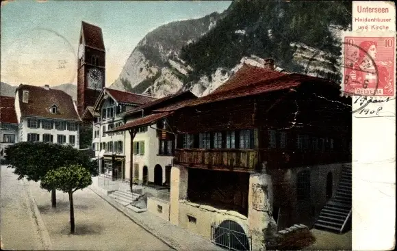Ak Unterseen Kanton Bern, Heidenhäuser und Kirche