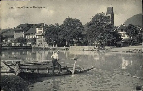 Ak Unterseen Kanton Bern, Landschaft mit Fluss, Fischer auf Boot, alte Gebäude, Bäume