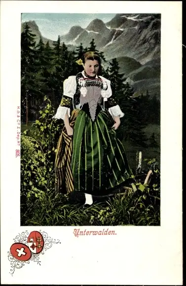 Ak Unterwalden Schweiz, Frau in Tracht, Wappen