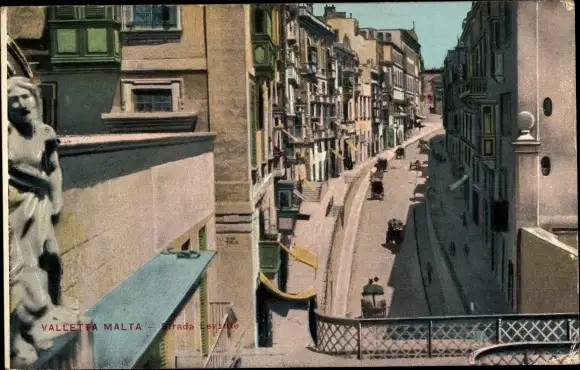 Ak Valletta Malta, Strada Levante, Straßenpartie, Statue