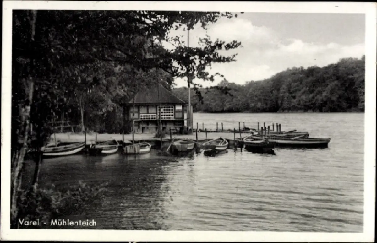 Ak Varel am Jadebusen, Mühlenteich, Boote am Anleger