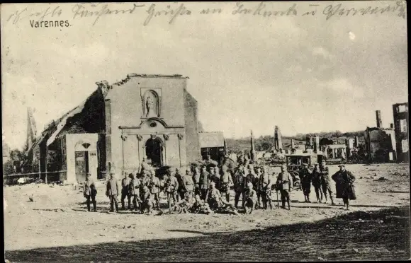 Ak Varennes en Argonne Meuse, Kriegszerstörungen, Deutsche Soldaten