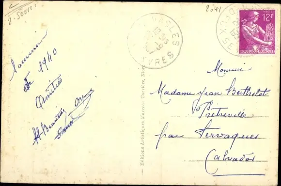 gelaufen 1957, Eckknick rechts oben, fleckig, sonst guter Zustand