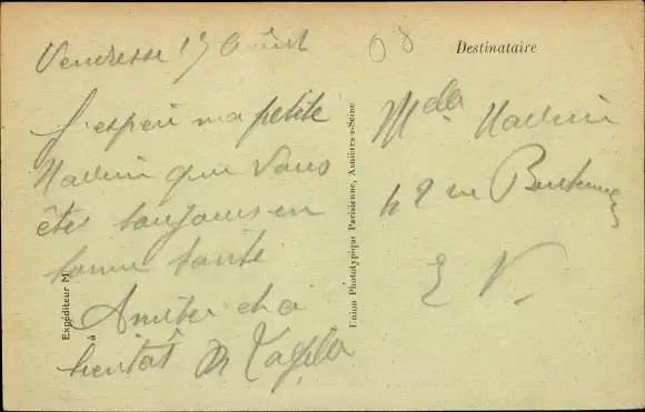 ungelaufen, datiert 1908, Rückseite beschrieben, sehr guter Zustand