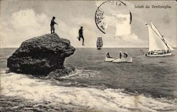 Ak Ventimiglia Liguria, Partie am Felsen, Boote