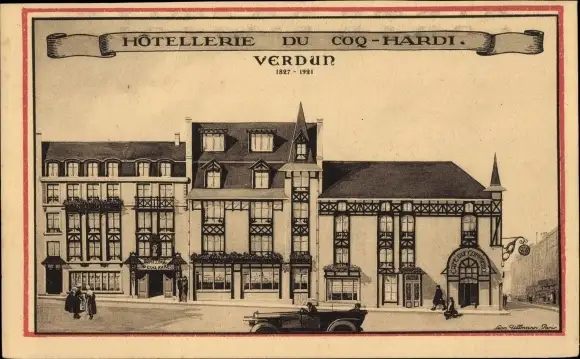 Ak Verdun Lothringen Meuse, Hotellerie du Coq Hardi, Cafe du Commerce, voiture