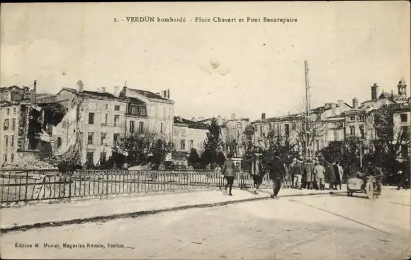 Ak Verdun Lothringen Meuse, Place Chevert et Pont Beaurepaire, Kriegszerstörungen, I WK