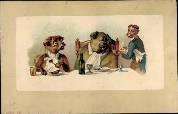Ak Vermenschlichte Hunde am Esstisch, Kellner