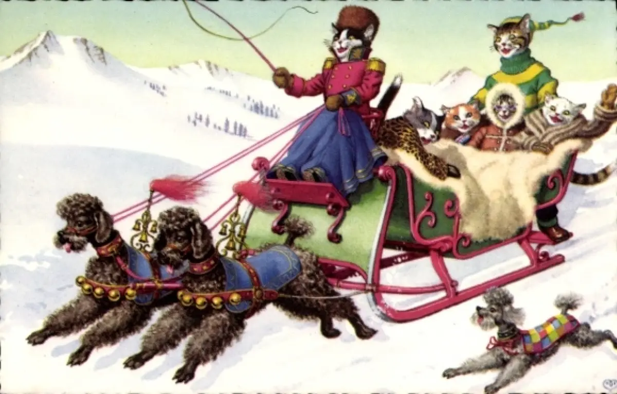 Ak Vermenschlichte Katzen, Schlitten, Pudel