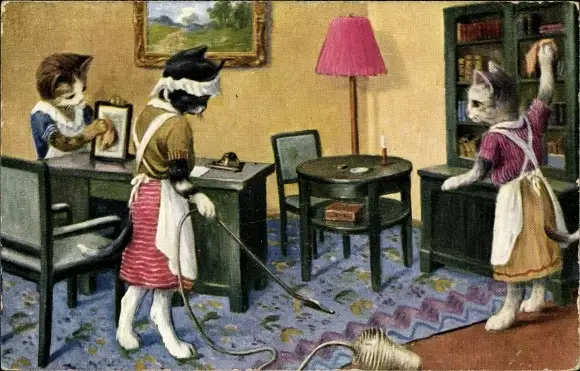 Ak Vermenschlichte Katzen beim Putzen, Staubsauger, Dienstmädchen