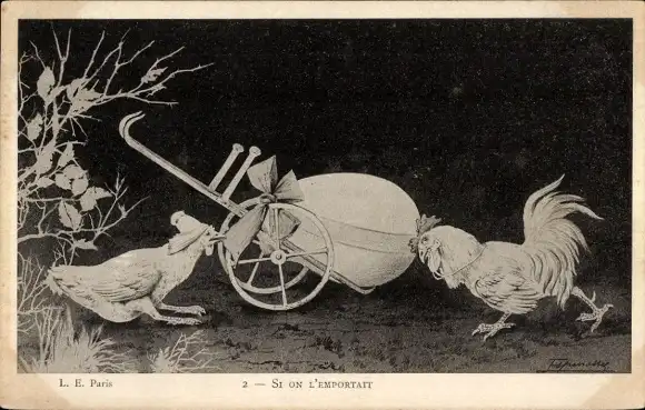Ak Vermenschlichte Tiere, Hahn und Henne, Ei