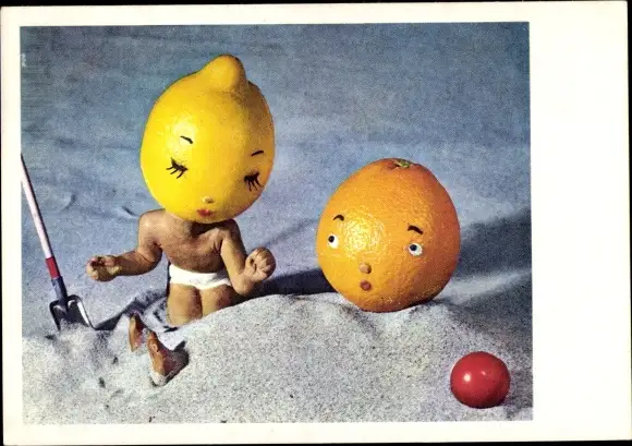 Ak Vermenschlichtes Obst am Strand, Zitrone, Orange