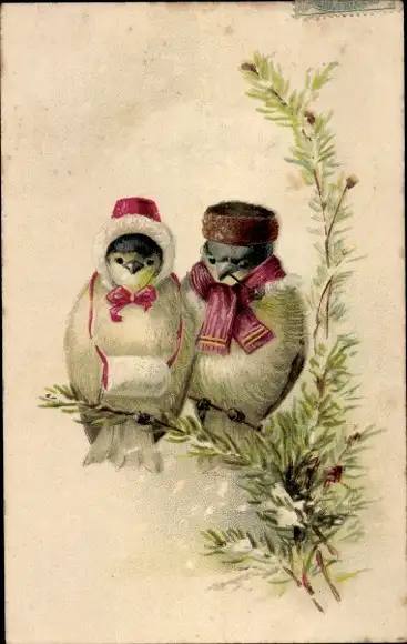 Ak Vermenschlichtes Vogelpaar auf einem Zweig