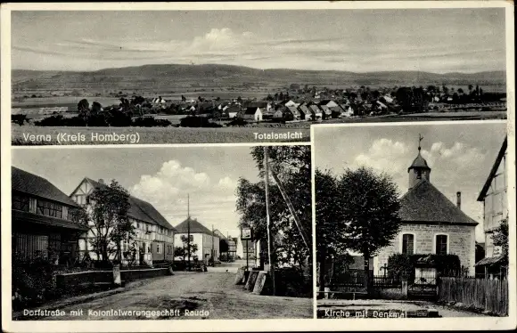 Ak Verna Frielendorf in Hessen, Panorama, Kirche, Denkmal, Dorfstraße, Kolonialwarengeschäft Raude