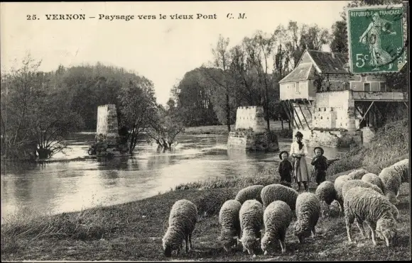 Ak Vernon Eure, Paysage vers le vieux Pont, Schafherde