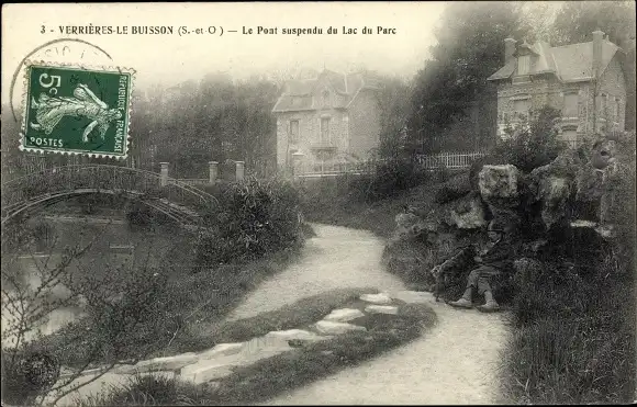 Ak Verrières le Buisson Essonne, Le Pont suspendu du Lac du Parc
