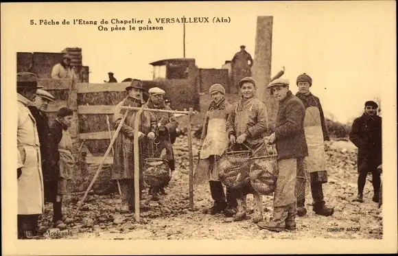 Ak Versailleux Ain, Peche de l'Etang de Chapelier, on pese le poisson