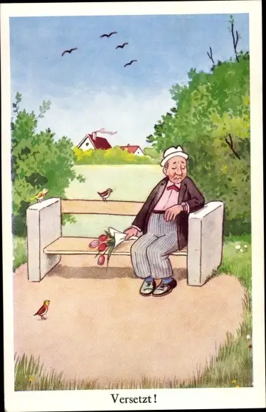 Ak Versetzt, Herr mit Tulpenstrauß auf einer Bank