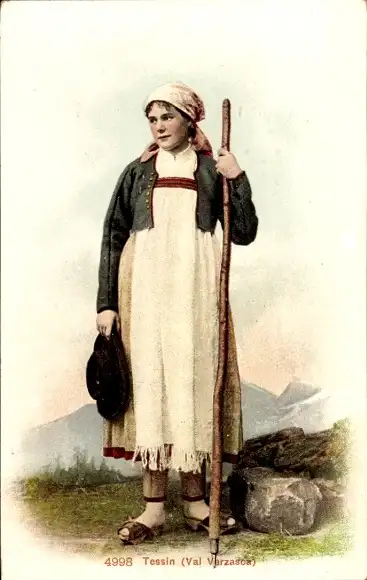 Ak Verzascatal Val Verzasca Kanton Tessin Schweiz, Hirtin in Tracht