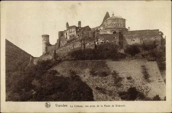 Ak Vianden Luxemburg, Le Chateau, vue prise de la Route de Diekirch