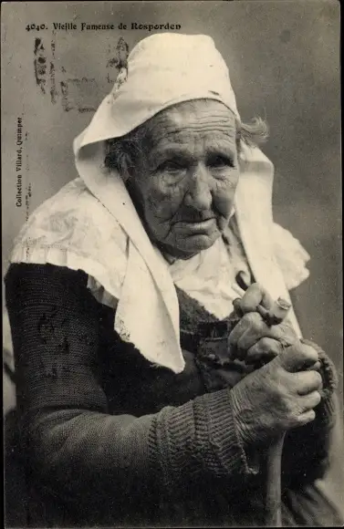 Ak Vieille Fumeuse de Rosporden, rauchende Frau in bretonischer Tracht