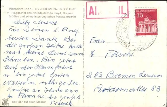 Ak Vierschrauben TS Bremen, Dampfer, Norddeutscher Lloyd