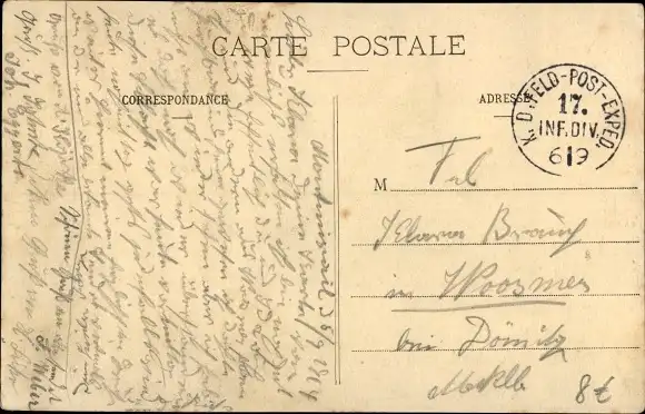 gelaufen als Feldpost 1914, 17. Inf. Div., sehr guter Zustand