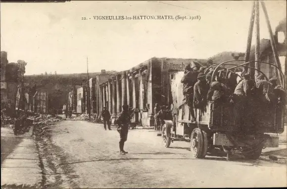 Ak Vigneulles lès Hattonchâtel Lothringen Meuse, Straßenpartie, Auto, Soldaten, Sept. 1918