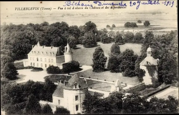 Ak Villeblevin Yonne, Vue à vol d'oiseau du Château