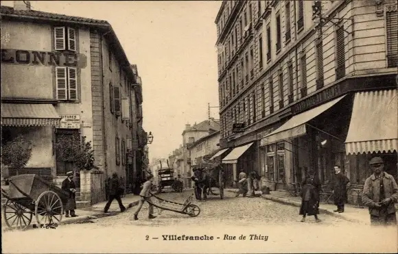 Ak Villefranche sur Saône Rhône, Rue de Thizy, Kutsche, Geschäfte