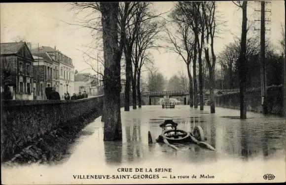 Ak Villeneuve Saint Georges Val de Marne, Route de Meulun, Inondations de 1910