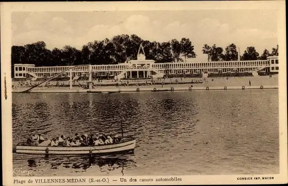 Ak Villennes Médan Yvelines, canot automobile, plage, toboggan aquatique