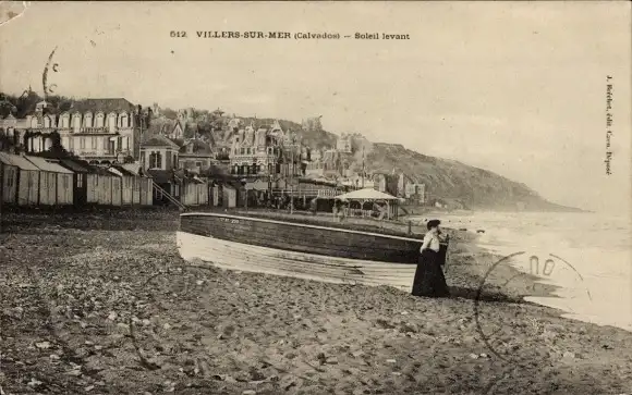 Ak Villers sur Mer Calvados, Strand, Boot, Soleil levant