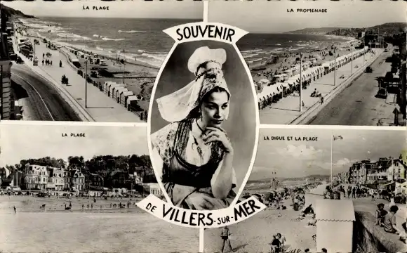 Ak Villers sur Mer Calvados, Strand, Promenade, Digue, Frau in Tracht