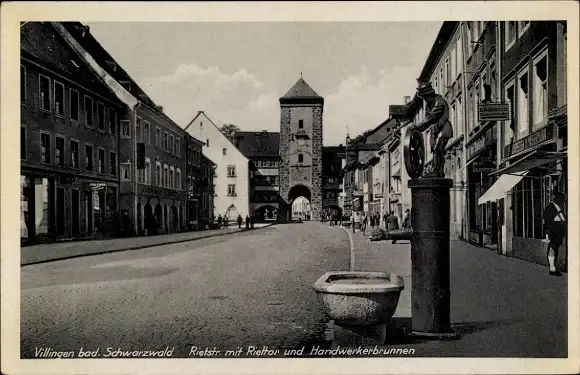 Ak Villingen im Schwarzwald, Rietstraße mit Riettor, Handwerkerbrunnen