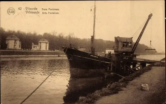 Ak Vilvorde Flämisch Brabant, Boot am Anleger, Kran, drei Brunnen