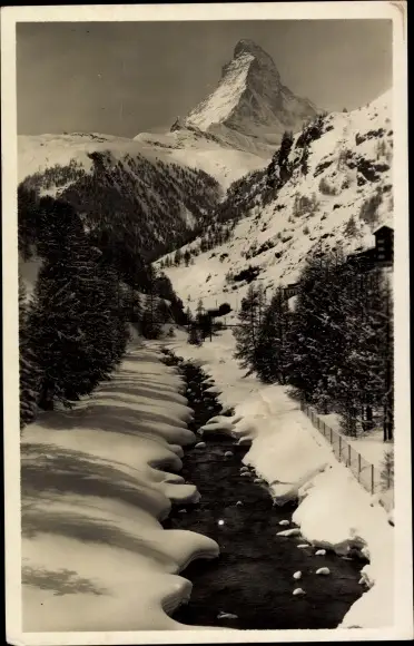 Ak Visp Kanton Wallis, Winteridyll mit Matterhorn