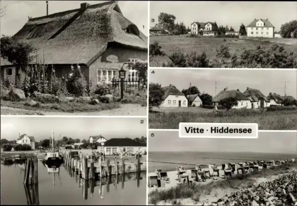 Ak Vitte Insel Hiddensee, Blaue Scheune, Hafen, Teilansicht, Fischerhäuser, Strand