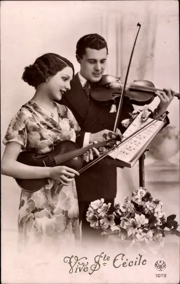 Ak Vive Sainte Cecile, Musizierendes Liebespaar, Geige, Noten