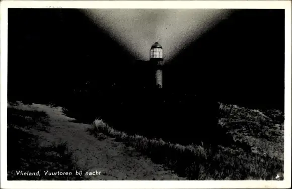 Ak Vlieland Friesland Niederlande, Leuchtturm bei Nacht