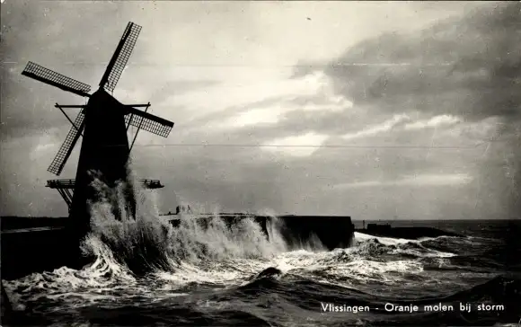Ak Vlissingen Zeeland Niederlande, Orangefarbene Windmühle während eines Sturms
