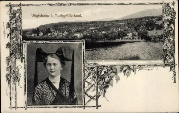 Ak Vögisheim Müllheim in Baden Markgräflerland, Frau in Tracht, Blick auf den Ort