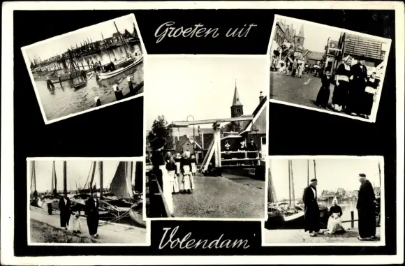 Ak Volendam Nordholland Niederlande, Hafen, Boote, Menschen in Trachten, Kirchturm