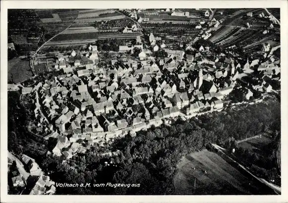 Ak Volkach am Main Unterfranken, Luftaufnahme von Volkach, Häuser, Bäume, Landschaft