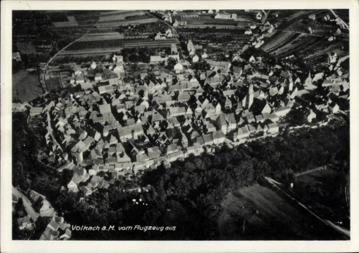 Ak Volkach am Main Unterfranken, Luftaufnahme von Volkach, Häuseransicht, Historisches Bild